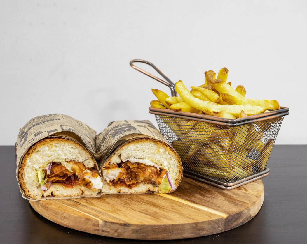 Poulet pané, garniture at 2 sauces au choix. Servi avec frites et 2 sauces pour frites au choix.