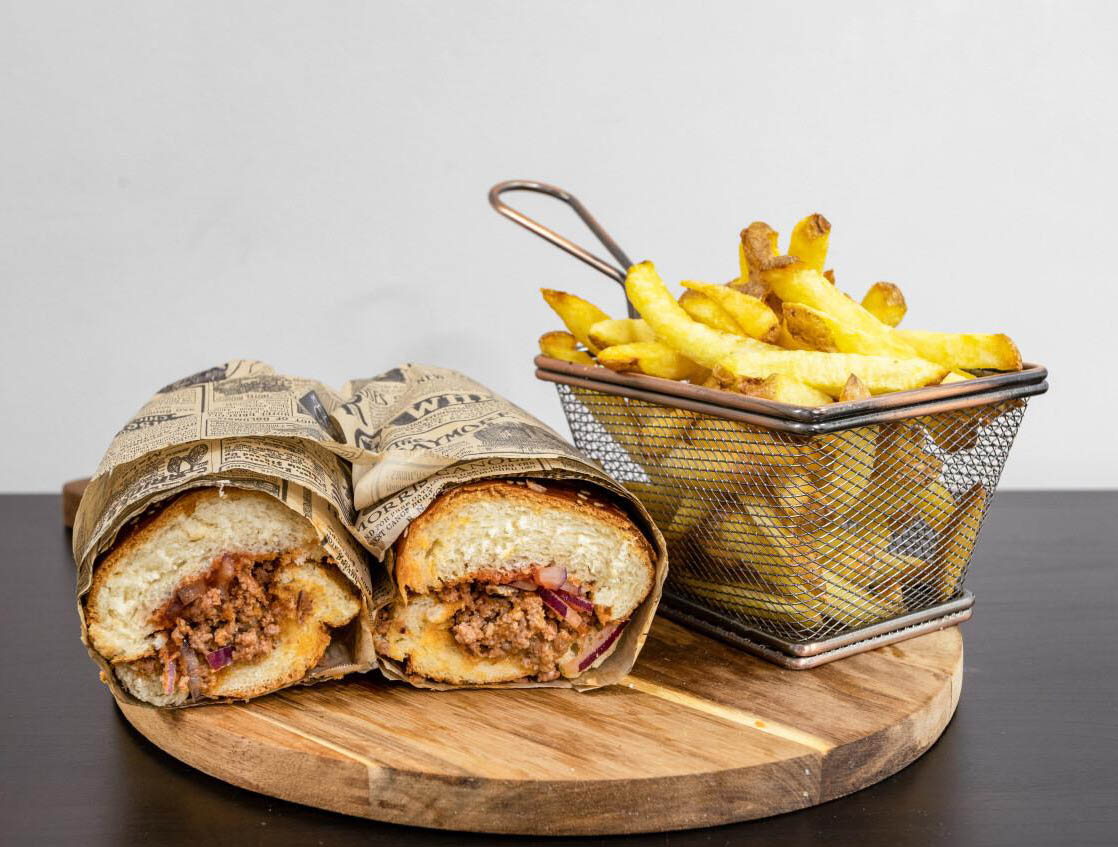 Viande hachée marinée, garniture et 2 sauces au choix. Servi avec frites et 2 sauces pour frites au choix.